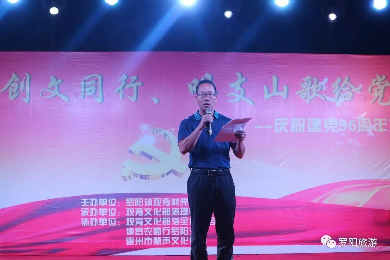 ,全力营造全民共建文明城市的浓厚氛围,6月30日晚,罗阳镇观背村举办了以“党建与创文同行、唱支山歌给党听”为主题的庆祝建党96周年文艺晚会。罗阳镇委书记林志华,镇委副书记、镇长陈湘,镇委副书记刘伟荣,镇委委员李永泉以及博罗农商银行罗阳支行领导等人出席了汇演。